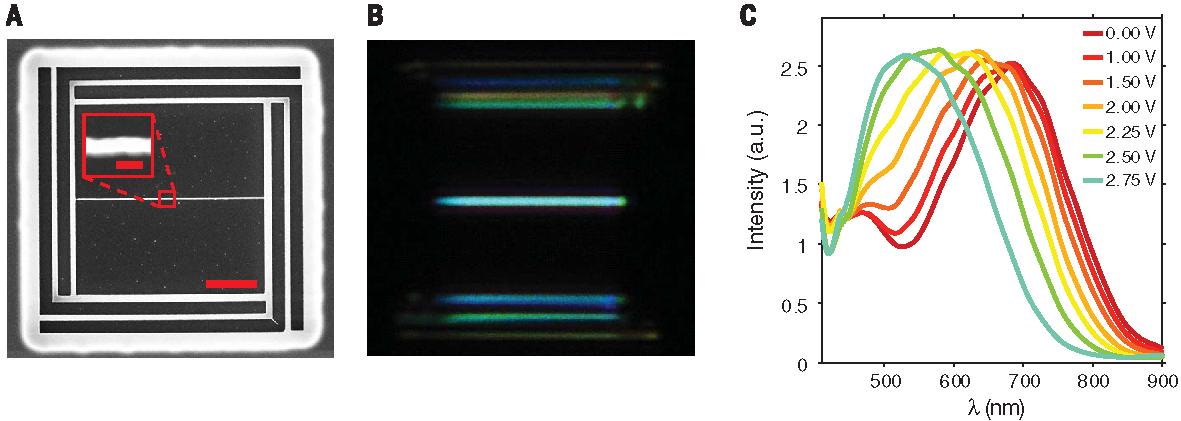 Fig. 2 Active tuning of light scattering with a nanoelectromechanical device. A Scanning electron micrograph of device with a suspended Si nanowire. Scale bars, 2 mm (main panel); 100 nm (inset) B Dark-field scattering image of the device. C Dark-field scattering spectra confocally collected from the Si nanowire under applied bias and TM polarization.