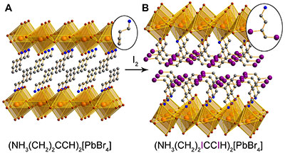 X-ray structures of iodine capture material: a before capture and b its reaction product with iodine. Insets show the individual cations in the organic layers. (Orange, purple, brown, blue, and grey spheres represent Pb, I, Br, N, and C atoms, respectively.)