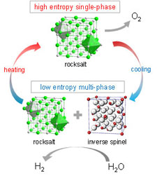 The inventors have formulated the entropy stabilized material, verified that it can produce hydrogen at 1200oC or lower (lower temperature than current state of the art), and performed repeatability studies to ensure that it can be cycled continuously to produce hydrogen.