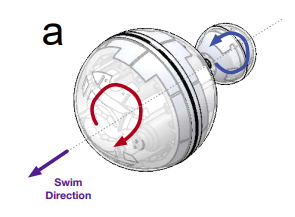 Figure (a) The design of a rotationally-symmetric swimming robot is pictured. Note that both the head and tail are spheres of different sizes (image credit: manuscript submitted to Nature Physics)