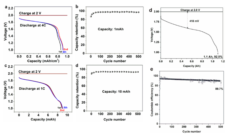 - Excellent cycling stability (1000 cycles without decay) at the areal capacity ranging from 0.5 to 2 mAh/cm2. Bench scale flow cell of 1.2 Ah and capacity retention of 89.7% at the 500th cycle.