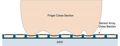 Figure description - Conceptual drawing showing the sensor as a fingerprint scanner. The “mechanical” part (i.e., the cells) is shown integrated with an ASIC to touch the deflection. Some of sensor cells would touch the ridges. Detecting the touched cells is the basis for creating the fingerprint.