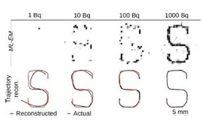 Figure 1 Single-source tracking. List-mode PET data from a point source (1, 10, 100, 1000 Bq) moving at 5 mm/s in an S-like pattern was reconstructed using a standard PET Maximum Likelihood Expectation Maximization reconstruction algorithm (top row) and the novel trajectory reconstruction method (bottom row). Results indicate the invention can track a moving source better than can be achieved using conventional MLEM.