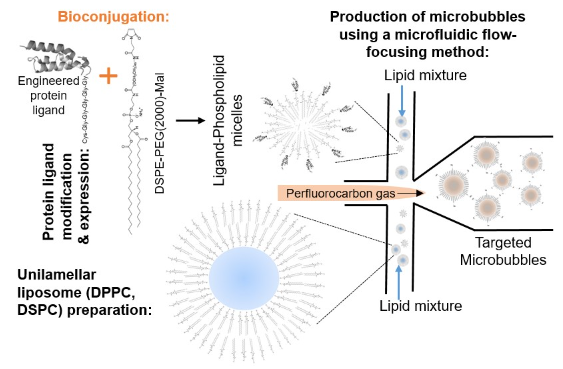 Description: Small protein ligands (example: affibody) engineered to bind to disease specific biomarkers are modified to express a terminal amino acid (example: cysteine) that enable clinically applicable bioconjugation (example: thiol-maleimide chemistry) of ligands to phospholipid micelles. Bioconjugates are mixed with phospholipid liposomal vesicles (example: DPPC, DSPC) and ultrasound responsive gas (example: perfluorobutane) to produce targeted microbubbles by traditional mechanical agitation methods (example: VialMix) or through microfluidic systems with specific chip geometries (example: flow-focusing chip format shown in the image).