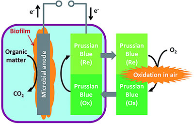 Schematic of the microbial battery (MB) equipped with a Prussian Blue (PB) cathode. The microbial anode produces electrons from organic matter. The electrons flow to the PB electrode that functions as a cathode and is reduced. When exposed to oxygen in air, the reduced PB is re-oxidized.