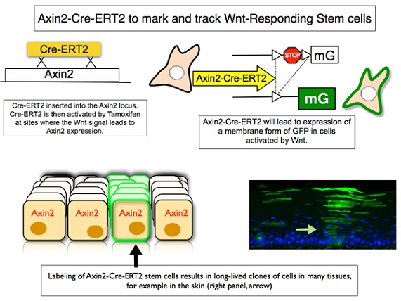 Researchers in Dr. Roeland Nusse's laboratory have generated an Axin2CreERT2 knock-in mouse strain that can be used to identify and map stem cells in any tissue. The Wnt/β-catenin signaling pathway is instrumental for stem cell maintenance in multiple tissues. Axin2 is an established direct target of this pathway and thus serves as a functional stem cell marker. The Axin2CreERT mouse marks Wnt/β-catenin responsive cells at distinct developmental time points in situ and traces their contribution to growth and differentiation in a variety of tissues. This mouse strain will benefit the stem cell research community as it enables stem cells to be traced in situ and thus provide true insight into stem cell origin and function in a normal developmental context.