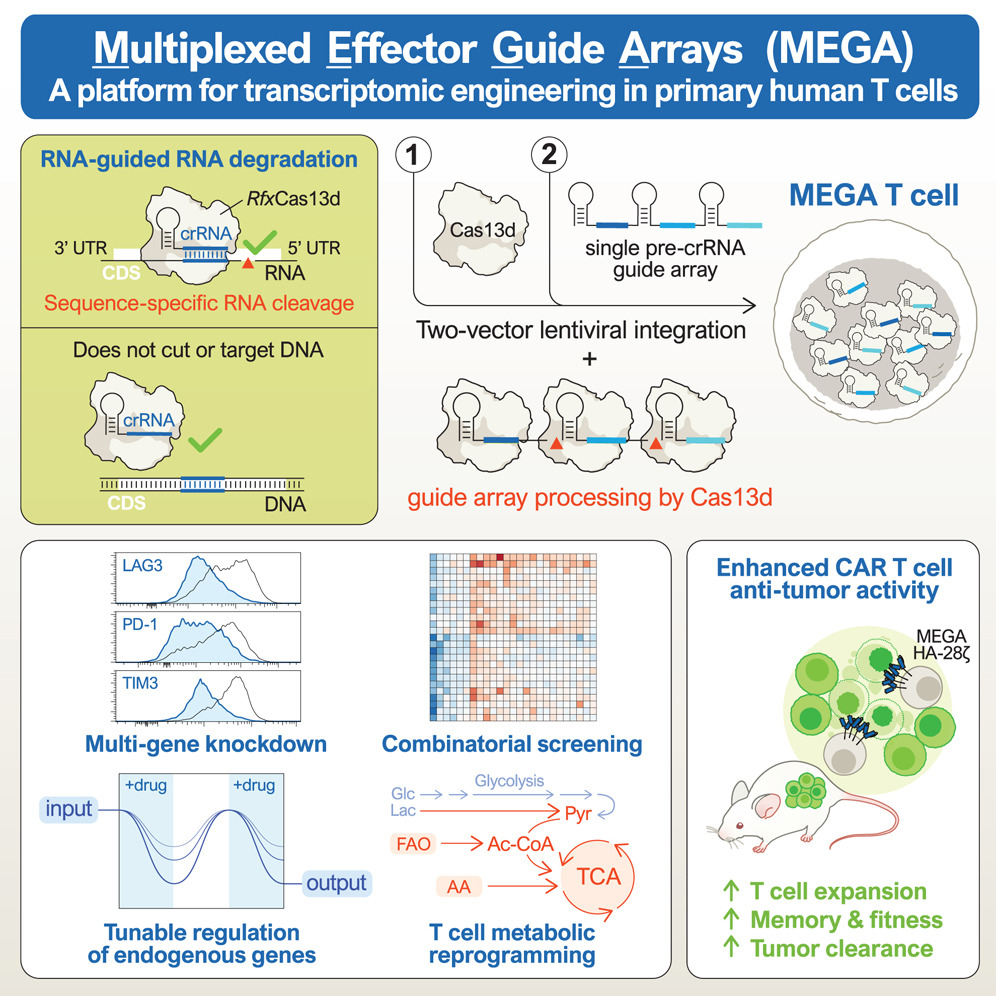 To overcome current gene editing safety, efficacy, and scope limitations, Stanford researchers in the Mackall Lab and Stanley Qi Lab developed MEGA (Multiplexed Effector Guide Arrays), a versatile and multifunctional platform for programmable and scalable regulation of the T cell transcriptome using RNA-guided, RNA-targeting activity of CRISPR/Cas13d, and successfully enhanced the anti-tumor activity of CAR T cells (see figure 1). MEGA uses molecular scissors to cut RNA, not DNA, to activate reversible changes to gene expression in T cells with expected lower genotoxicity and chromosomal rearrangements compared to CRISPR/Cas9. MEGA is quantitative, tunable, and regulatable without binary changes to genome. It acts quickly and downstream of chromatin remodeling. Researchers demonstrated they could make 10 edits at once to human T cells, compared to 3 with Cas9. MEGA is a safer, more effective, more versatile, and reliable addition to the synthetic immunology toolkit, with many applications in cancer immunotherapy and research.