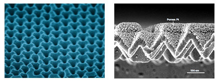 A team of Stanford engineers have developed a low-cost, easy to fabricate membrane electrode assembly (MEA) that is nano-patterned to increase electrode reaction surface area in solid oxide fuel cells (SOFCs). These electrolytes are created with nano-sphere lithography techniques that eliminate the need for photo-lithography intensive steps. The resulting MEA has a thin electrolyte layer shaped into 3-D close-packed hexagonal pyramid arrays. This architecture reduces ohmic loss for better performance at operating temperature between 400-500oC.