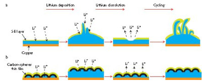 Figure description-Schematic diagrams of the different Li anode structures. a, A thin film of SEI layer forms quickly on the surface of deposited Li (blue). Volumetric changes during the Li deposition process can easily break the SEI layer, especially at high current rates. This behaviour leads to ramified growth of Li dendrites and rapid consumption of the electrolytes. b, Modifying the Cu substrate with a hollow carbon nanosphere layer creates a scaffold for stabilizing the SEI layer. The volumetric change of the Li deposition process is accommodated by the flexible hollow-carbon-nanosphere coating.