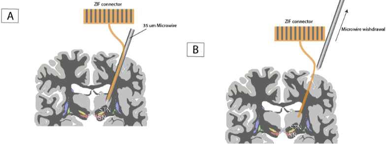 Figure description - Method of insertion of the “Neuroroot” film into the brain tissue. Once the ultra-flexible electrodes are attached onto the microwire, the device is inserted into brain tissues. The liquid present into the brain is enough to detach the electrodes from the microwire which is subsequently removed from the brain. This way only the mesh of ultra-flexible and ultra-low profile electrodes is remaining into brain tissues.