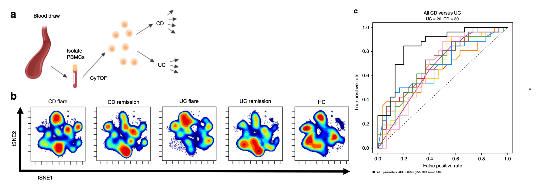 The researchers have identified several blood-based signatures that differentiate CD from UC, and most importantly perform similarly to the standard-of-care endoscopy/colonoscopy for patients who have active disease – the most significant clinical unmet need. They have developed the diagnostic markers on a training patient cohort using mass cytometry (CyTOF) and validated the discriminatory performance on an independent validation patient cohort dataset using conventional clinical flow cytometry. They continue to study the markers on additional patients and optimize the diagnostic model to differentiate other clinically-relevant subtypes of IBD and predict therapeutic response to improve precision medicine in IBD and save patients and the healthcare system time, cost and adverse effects.