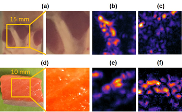 Optical images of portions of pig kidney (a) and salmon (d), with the corresponding non-linear contrast (b) and (e) compared to linear contrast (c) and (f) ultrasound images.