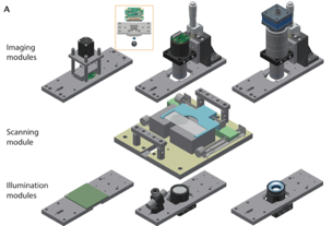 Figure description - Low-cost, open source and modular automated scanning/tracking fluorescent microscope. (A) Construction of the modular microscope with swappable parts.