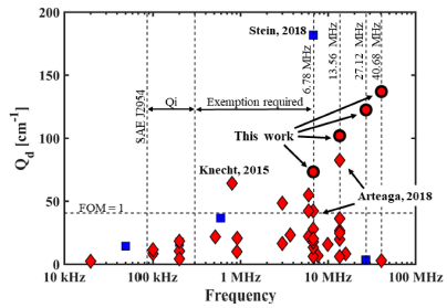 Figure 2 Comparison between this work and the state-of-the- art in coils demonstrated in inductive WPT systems. Red- fill 'diamonds' (existing literature) and '•' (this work) indicate air- core designs and blue-fill 'squares' indicate designs using magnetic materials. The minimum of QL and QT are plotted if both are provided. FOM = 1 is simulated performance for a loop of wire. Only the highest Qd design at each ISM band from this work is shown.