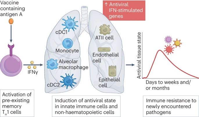 Stanford researchers have found that the interaction between the adaptive and innate immune systems and non-hematopoietic cells in tissues is key to antigen-agnostic protective immunity. Based on their previous finding that BCG vaccine induces heterologous immunity via CD4 T-cell derived IFN-gamma, which imprints an antiviral state on the innate immune system and epithelial cells, they developed a vaccine containing antigen ovalbumin and GLA/3M-052 adjuvants, which elicit IFN-gamma responses. In vaccinated mice, antigen-stimulated T cells imprinted prolonged and broad innate-mediated antiviral resistance in myeloid and epithelial cells, protecting mice against SARS-CoV-2 and influenza viruses, unrelated to the administered antigen.