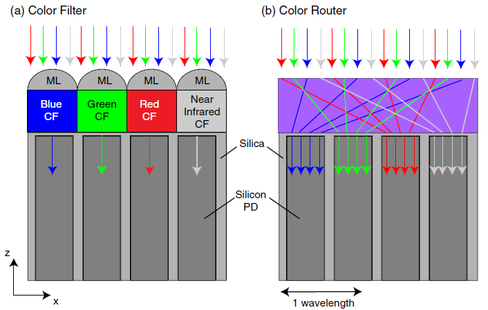 Image sensors are used across the board in high-resolution image sensing technologies, and critically rely on their ability to separate colors of light. Current commercial standards utilize color filters, which absorb unwanted wavelengths to filter and transmit only the desired color to the photodetector of the corresponding color channel, , e.g., red (R), green (G), blue (B). Although effective, this design is very inefficient and captures only a small fraction of light at the detector (less than 20-25% for a color filter array with a typical 2 by 2 pixel RGGB Bayer kernel), which makes low light imaging challenging and limits the practical size of image sensor pixels. The Fan group has designed a color router based on lossless materials that cleanly routes all incident light based on its spectral content (colors) with perfect (~ 100%) photon efficiency to the proper photodetector for all color channels. This results in a 4-5 times increase in the number of photons at the pixel photodetector level compared to a color filter-based approach. This color router design allows further scaling of image sensor pixels to sub-wavelength sizes ( 400 nm) since no light is reflected or absorbed. The underlying design principles can be applied to any desired wavelength of light and dielectric materials, allowing this technology to push the performance and size in color-separating devices to the absolute limit.