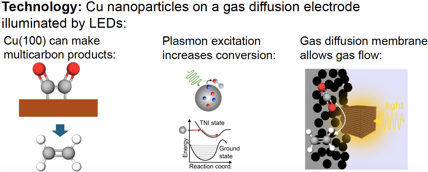 In the prototype system, gas enters the reactor cell via a gas flow channel, flows over the gas diffusion electrode covered in copper nanoparticles and electrolyte solution at ambient temperature. Visible light (450-800 nm) enters through the cell window, exciting copper nanoparticle electrons that reduce CO2 to ethylene. These electrolyzers can produce hydrocarbon based chemicals and syngas, a mixture of H2 and O2. Unlike competing electrolyzers that are built to operate on large scales, with long payback periods that typically require high capacity factors, the D-Lab system (Figure 2) can operate when renewable energy is in excess, generating net-zero emissions and converting point-source CO2 emissions to high-value products. This inexpensive, scalable plasmonic gas flow reactor system provides cost effective carbon capture CO2 gas separation and storage while producing valuable feedstocks for the chemical industry or zero-carbon fuels.