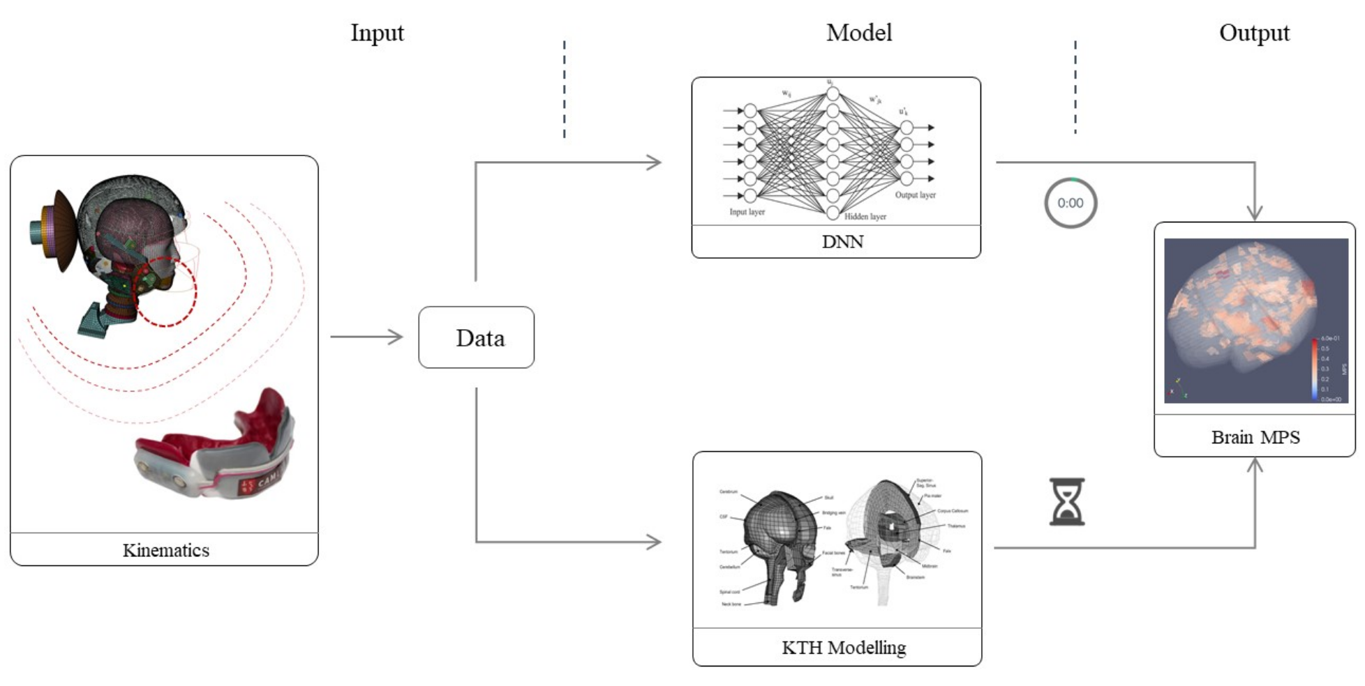 Stanford researchers at the Camarillo Lab have developed a neural-network based model that can provide real-time calculation of brain strain based on instrumented mouthguard kinematics signals. This fast and accurate calculation can help better protect athletes wearing the instrumented mouthguard disclosed in Stanford docket S15-432.