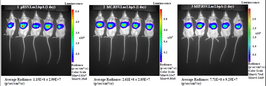 DNA constructs injected into mouse livers showed luciferase expression from MIP vectors was 7-fold higher than plasmid vectors and 3-fold higher than minicircle vectors.