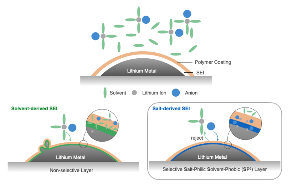 Researchers in the Zhenan Bao Group and the Yi Cui Group have developed a Salt-Philic, Solvent-Phobic (SP2) Li anode polymer coating that dramatically out performs state of the art Li anode coatings/electrolyte strategies battery cycle life. Lithium metal batteries (LMBs) show great potential as next-generation batteries, but they suffer capacity degradation caused by whisker-shaped lithium growth at the lithium metal and electrolyte interface The Salt-Philic Solvent-Phobic polymer coating selectively transports salt over solvent and fosters salt-derived solid electrolyte interface (SEI) formation (see figure 1), which stabilizes the interface and enhances cycling performance in several solvents, such as ether, carbonate, and fluorinated ether. Li||NMC cells with SP2 anodic coating enhanced cycle life by nearly 2X for a high-performance fluorinated-ether electrolyte and a standard carbonate electrolyte. The highly compatible SP2 coating can be further improved as promising electrolytes become available.