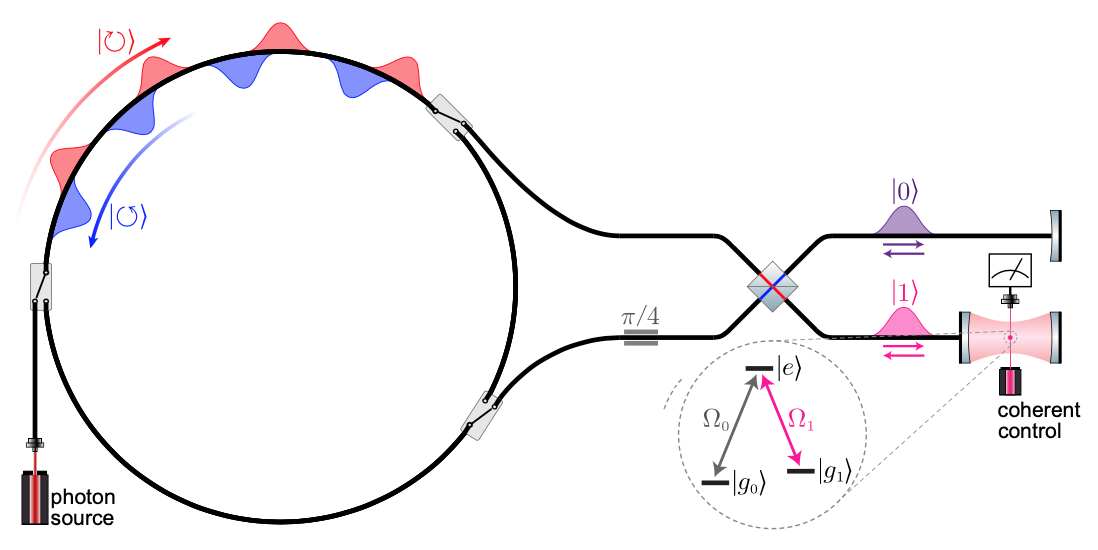 Researchers at Stanford University have designed a scalable photonic quantum computer which does not require single-photon detectors and which uses minimal quantum resources: one coherently controlled atom. Photonics offers many advantages over superconducting systems as a platform for quantum computing, but it typically lacks scalability since machine size scales with quantum circuit depth. The Fan Group's design (Figure 1) uses a single atomic qubit controlled by a laser to indirectly manipulate the state of a large number of photonic qubits which counter-propagate through a fiber optic ring. Any quantum circuit can be deterministically implemented by this device, and readout of the quantum state is not limited by the low efficiencies of single-photon detectors. Unlike most designs for photonic quantum computers, the physical size of this device is independent of quantum circuit depth. This scheme has high fidelity even in the presence of realistic experimental imperfections and is significantly simpler and less resource-intensive than existing paradigms for photonic quantum computing.