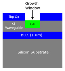 Stanford researchers have patented a fabrication process to achieve highly-selective growth on silicon substrates with no sidewall growth. A thin dielectric layer covers the exposed Si sidewalls of the growth region, prevents Ge growth on the sidewalls, and restricts it to the bottom of the growth window. The method is applicable for Ge, SiGe alloy, or InGaAs alloy selective area growth. This process facilitates low-insertion-loss, high performance Ge and Ge/SiGe QW waveguide modulators and photodetectors monolithically integrated with SOI waveguides.