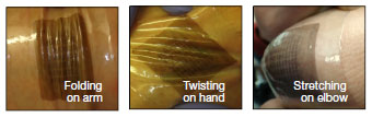 Stretchable transistor as skin-inspired wearable device: Stretchable transistor mounted on human limbs to test tolerance to various common movements that might be expected in a wearable device. The device maintains average mobility at >0.1cm2V-1s-1 under all these conditions.