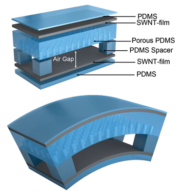 Energy harvesting / self powered e-skin schematic of Polydimethylsiloxane (PDMS) and single walled carbon nanotube (SWNT) device film layers