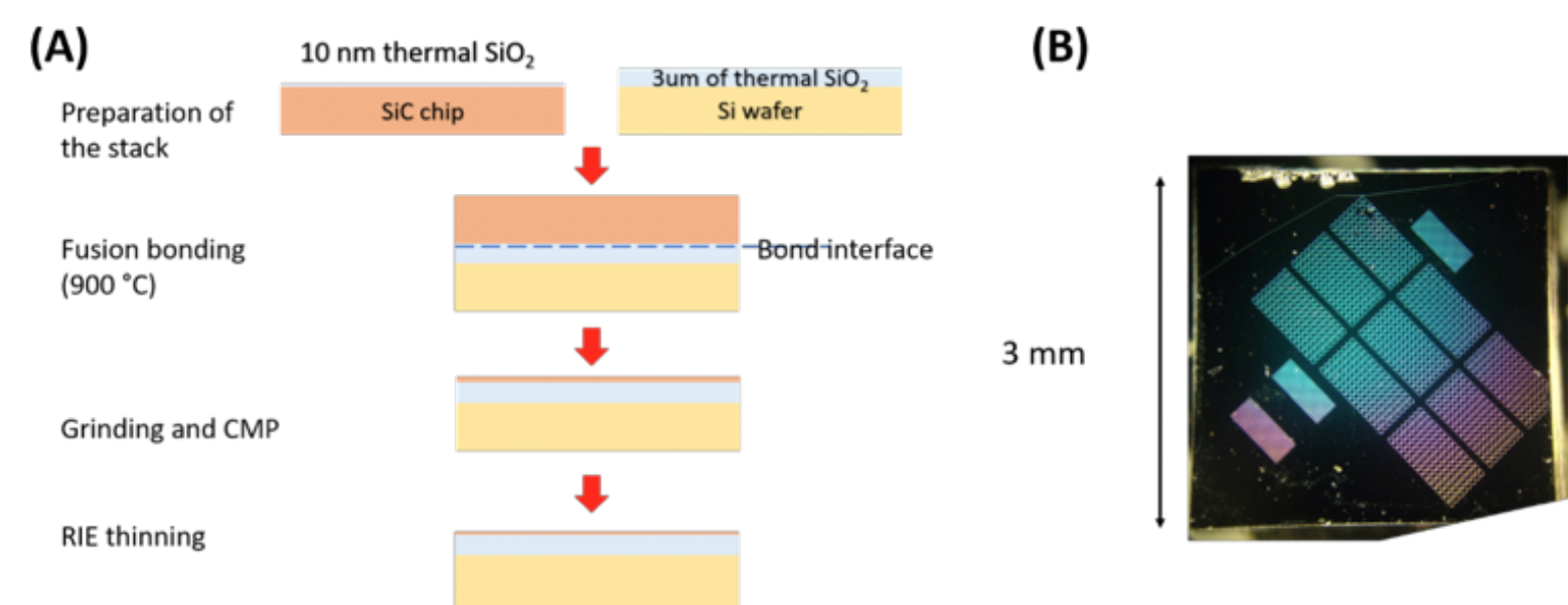In response, Vuckovic's researchers developed an alternative using bonding, thinning and polishing techniques. To produce films of 4H-SiC on SiO2 on Si (Silicon-Carbide-on-Insulator or SiCOI) they use oxide-oxide bonding, wafer thinning based on grinding and reactive ion etching, and chemical-mechanical polishing. (See figure 1.)