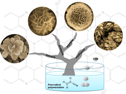 Synthesis of carbon flower superstructures: This schematic image shows the variety of structures formed by varying the solvents for this simple polymerization process. Additional shapes and pores can be introduced by incorporating other co-monomers.