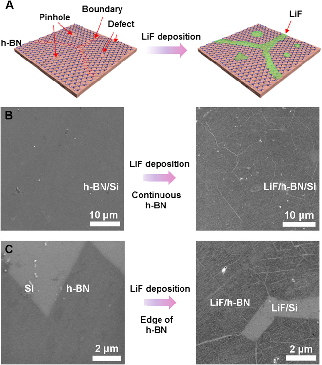(A) Schematics of selective ALD LiF deposition on h-BN. (B) SEM characterization of 50 cycles of ALD LiF deposition on continuous h-BN. (C) SEM characterization of 50 cycles of ALD LiF deposition on the edge of h-BN.
