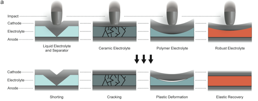 Figure description - a) Schematic of the response of different LIB electrolyte materials after being subjected to an impact. Liquid, ceramic, and polymer electrolytes short, crack, and deform respectively. Meanwhile, an elastic electrolyte material can reversibly recover and survive the impact event to continue operation.