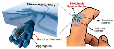 Stanford researchers have created a highly stretchable organic semiconductor by blending high mobility semiconducting polymers with an elastomer. The CONPHINE (conjugated polymer/elastomer phase separation induced elasticity) semiconducting film can be stretched up to 100% strain without affecting mobility, retaining values of 1 cm2 V-1s-1, comparable to that of amorphous silicon. The charge carrier mobility of these durable films are maintained even after 100 times stretching cycles under 100% strain - making CONPHINE films excellent candidates for wearable technology, biocompatible devices, and electronic skins for robotics or prostheses.
