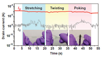 CONPHINE TFT drain current under stretching, twisting, and even poking by a sharp object.