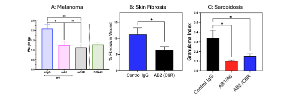 Leung Lab mouse studies demonstrate that the monoclonal antibodies have the benefit of modulating Spp1+ macrophages over a range of indications, in particular the treatment of cancers refractory to current standard of care, granuloma formation in Sarcoidosis. Skin fibrosis and scarring is an attractive indication since there is no effective treatments for keloids, traumatic wounds and cosmetic surgeries.
