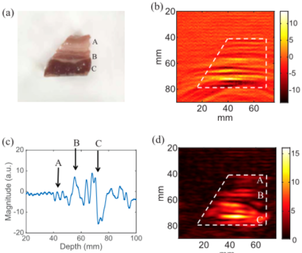Figure Description (a) Pork belly tissue used in the experiment. (b) 2D raw matched filtering image. (c) 1-D matched-filtering result between measured signal and transmit reference signal. (d) Reconstructed image using FD-SAR. In the figures, A–C denote the top skin, middle muscle, and bottom muscle layers.