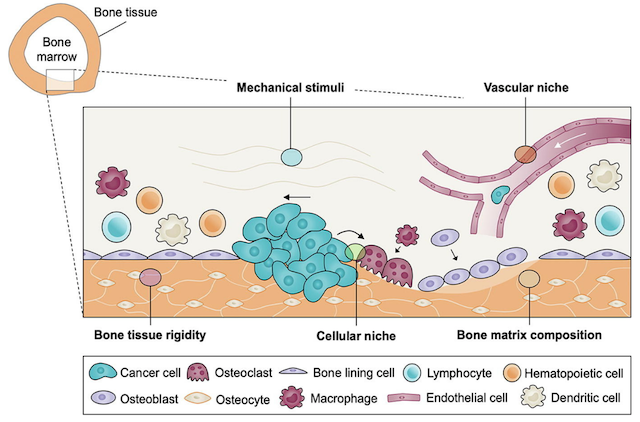 Figure description - Schematic of multifactorial bone cancer niche, highlighting the cell-cell and cell-matrix interactions at the bone marrow/long bone interface