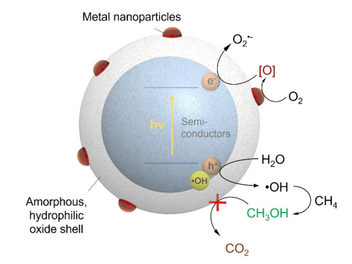 Structure of the new photocatalysts for methane partial oxidation at room temperature. The researchers have shown that enclosing photocatalysts with transport selective structures is a generalizable strategy to achieve high selectivity and activity simultaneously in photochemical alkane oxidation reactions. (image credit: the inventors)