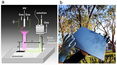 - Open air: Deposition occurs in an open-air environment and at atmospheric pressure, unlike typical solution-processed material.