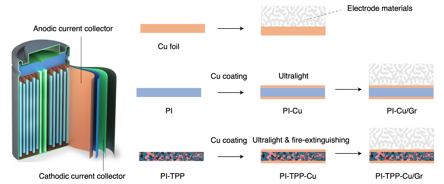 Researchers in Stanford's Yi Cui Lab have developed an ultra-light, fire-retardant battery current collector. Commercial Cu-Al current collectors account for 15-50 wt.% of the total battery weight – dead weight that dramatically limits battery density. Thus far, strategies for safer and higher energy density batteries have fallen short. The Yi Cui Lab design uses a fire retardant, triphenyl phosphate (TPP) embedded, lightweight polyimide (PI) that is coated on both surfaces with an ultrathin layer of copper (Figure 1). The copper distributes current and protects the fire-retardant polymer. Full cells with the PI-TPP-Cu current collector shows significantly increased energy density by 16~26% compared to commercial Cu and Al foil current collectors, and is cheap and easy to manufacture. This universal current collector design holds enormous promise for safer lithium batteries with higher energy density for different battery systems.