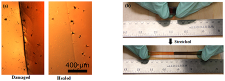 Self-healing properties of the polymer film. Photographs of (a) damaged and healed samples and (b) healed film before and after stretching.