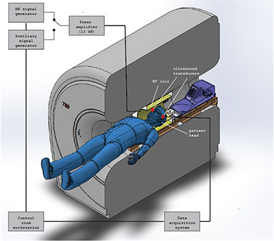 Fig. description: MR scanner with proposed closely coupling ultrasound transducer configuration.